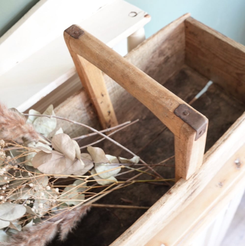 Grande caisse ancienne en bois à poignée pour les fruits.