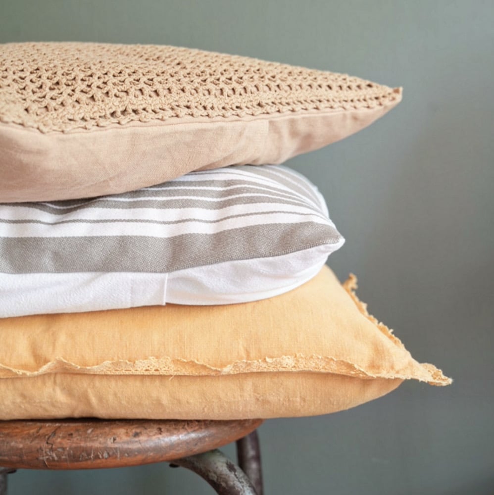 - Housse cousue dans un drap ancien en lin teint en coloris tabac, recto au crochet dans la même teinte et fermeture par rabat au verso. Dimensions 40x40 cm,