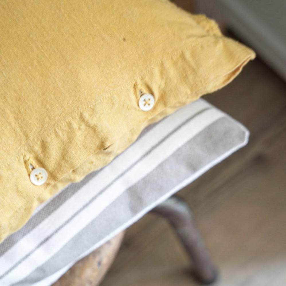 - Housse ancienne en lin teinte en coloris tournesol, fermeture par boutons en nacre et détail de broderie anglaise sur 3 côtés. Dimensions 30x40 cm,