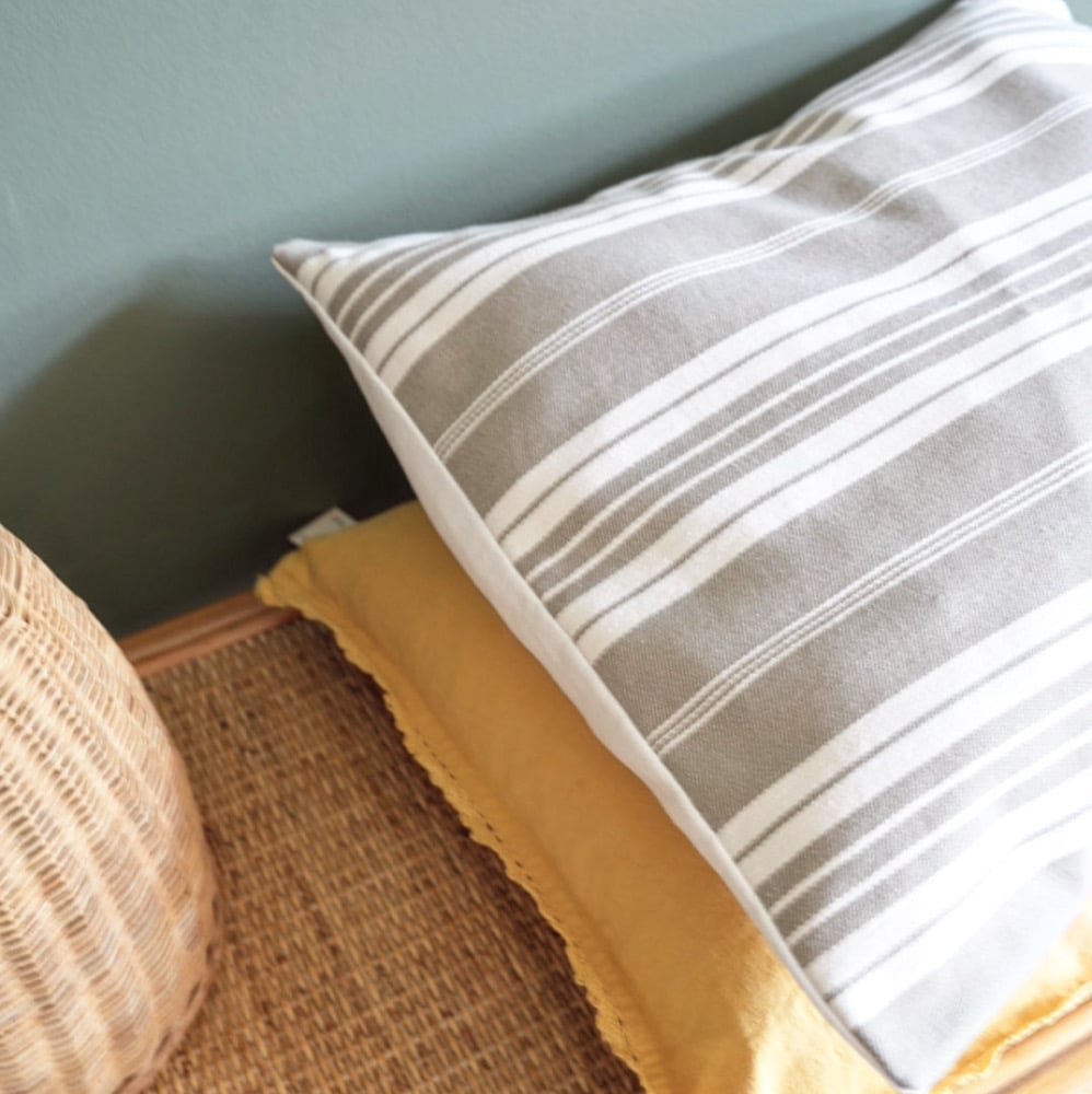 - Housse cousue dans une ancienne toile à matelas épaisse à rayures grises pour le recto, verso en drap de coton blanc avec rabat. Dimensions 40x40 cm.