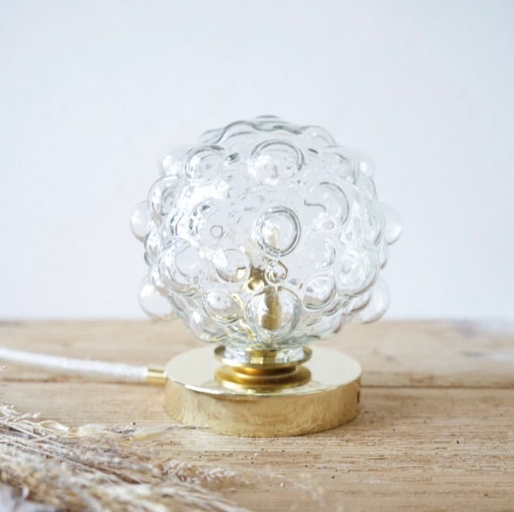 Lampe à poser composée d’un globe ancien orné de bulles en relief, modèle de la créatrice finlandaise Helena Tynell années 60-70, et d’électricité entièrement neuve.