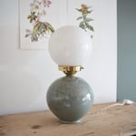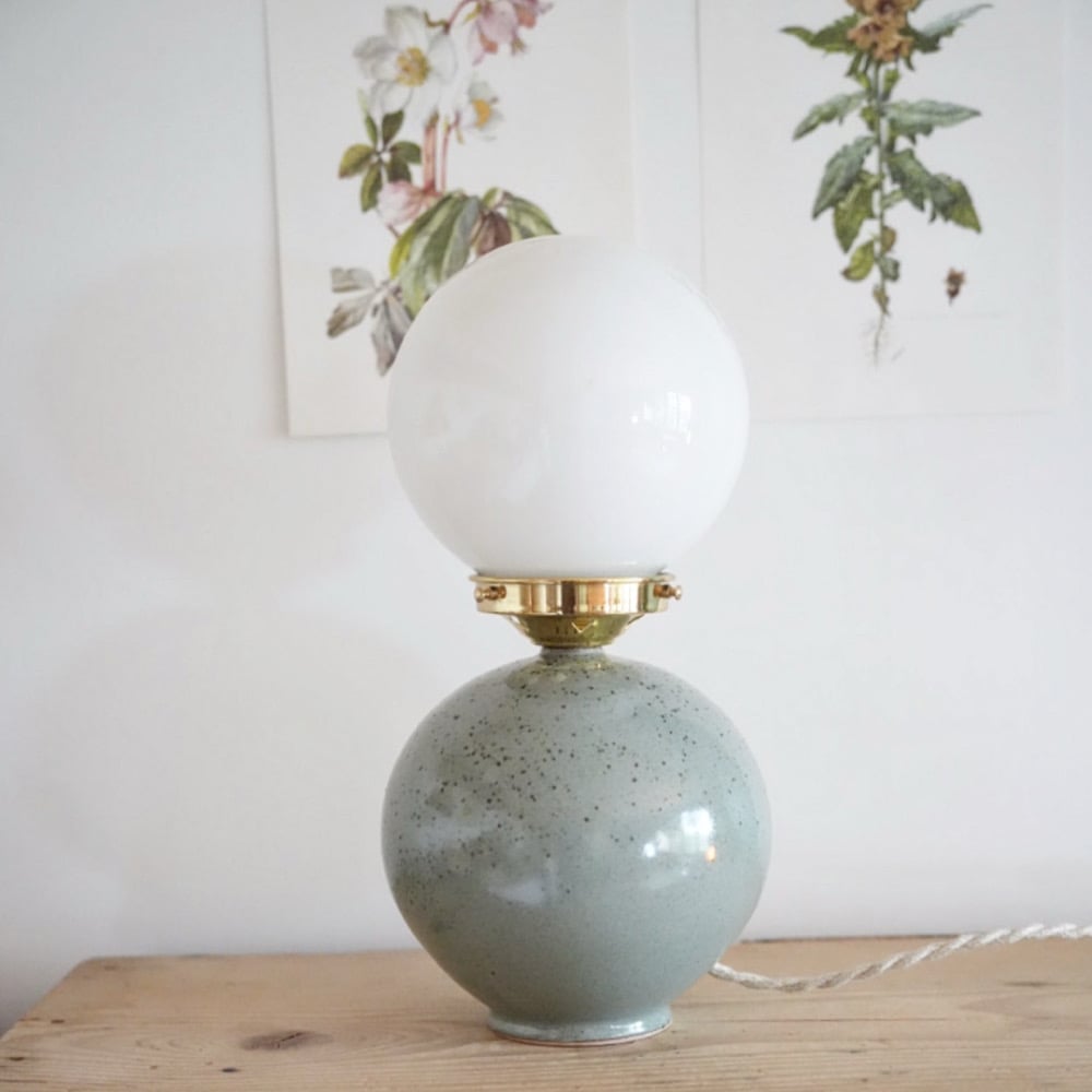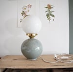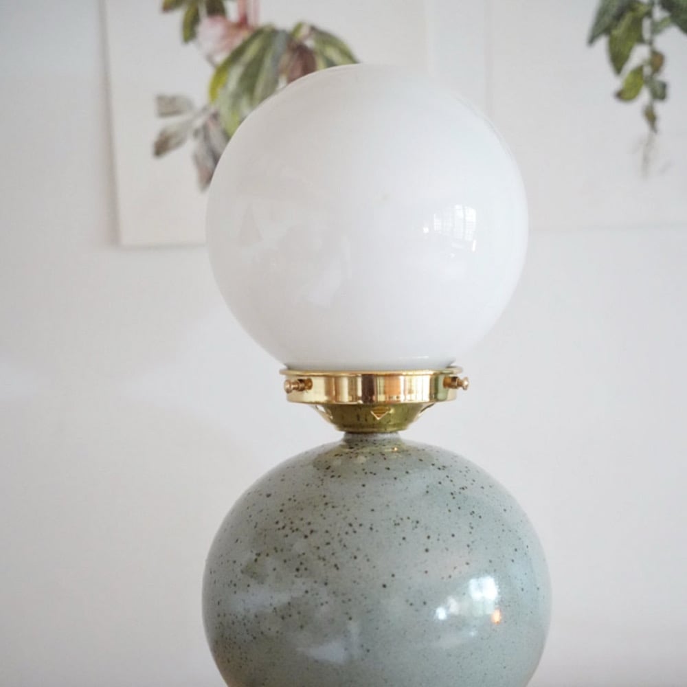 Lampe à poser composée d’une base en céramique et d'un globe ancien en opaline blanche. L'électricité est entièrement neuve.